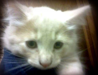 This is little lion (Officially named Rocko by his new family) He's a beautiful, long-haired white kitten who loves climbing up jackets that are hanging on chairs, and has had a very distinct crying face since he was tiny (as seen below)